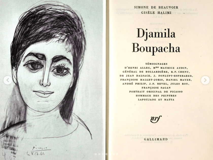 Cover of Djamila Boupacha (1962) written by Gisèle Halimi and prefaced by Simone de Beauvoir, with Picasso’s illustration of Boupacha